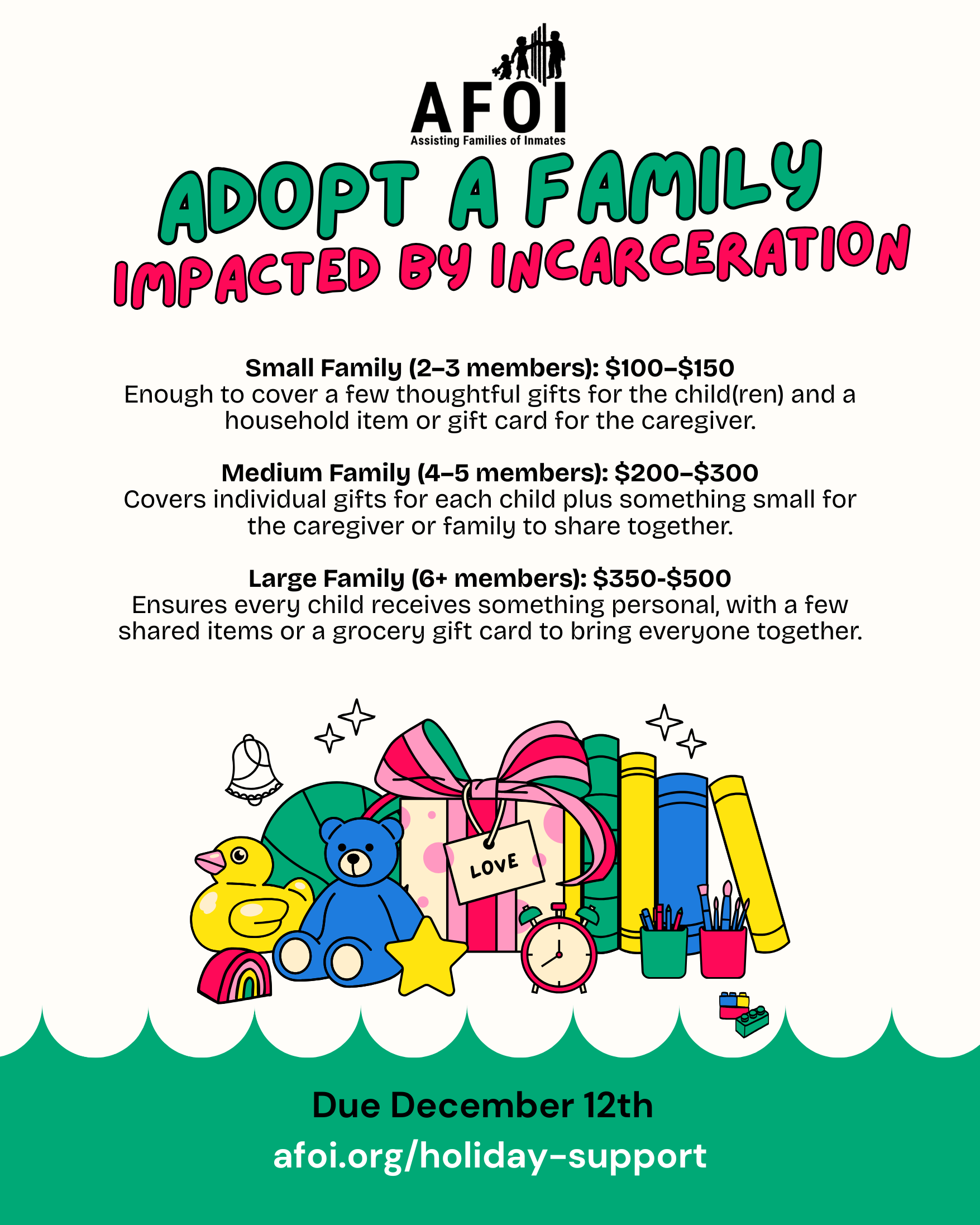 This year, we’ve received more requests than ever from families impacted by incarceration who could use a little extra care during the holidays. There are many ways to help, and every act of generosity makes a real difference.